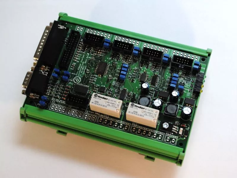 Breakout board zum Anschluss mehrerer Schrittmotor-Endstufen an einen PC LPT. 2 Relais für Schaltfunktionen, Endschalteranschluss auch für induktive Näherungsschalter, I/Os umschaltbar zwischen 5V, 12V und 24V.